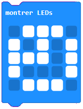 Le bloc "Montrer LEDs" permet d'allumer les LEDs désirées sur l'affichage de la carte Micro:bit. Vous pouvez dessiner votre propre icône ou symbole en cliquant sur les LEDs. |