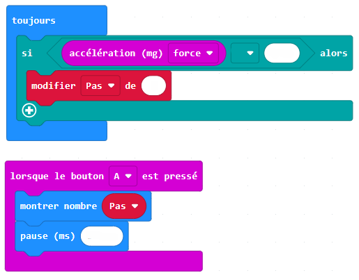Pour cela, vous allez utiliser l'accéléromètre afin de mesurer l'accélération à laquelle est soumise la carte Micro:bit à chaque pas de l'utilisateur.